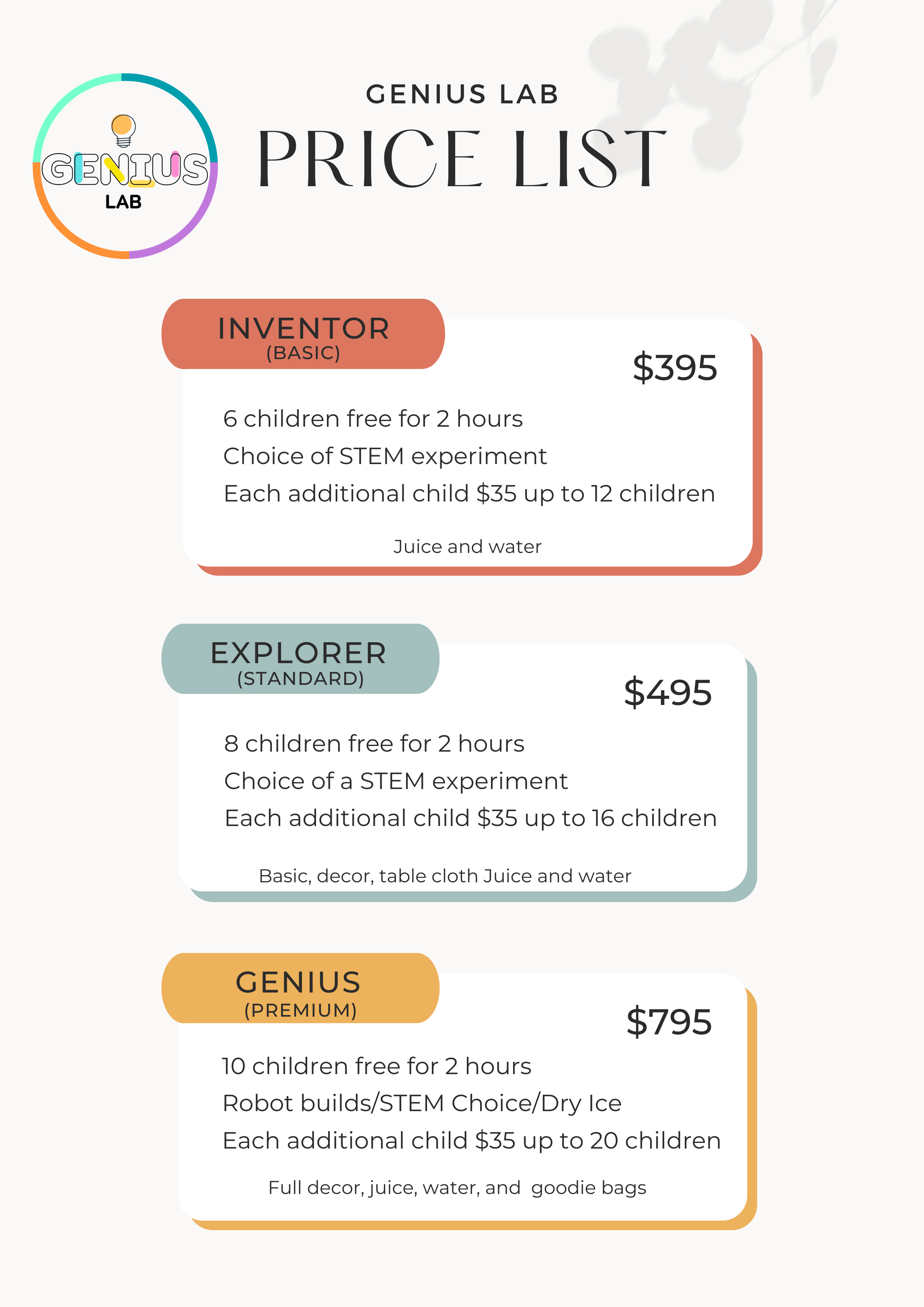 "Our Genius Lab is looking forward to making every junior scientist's birthday party the best ever!"